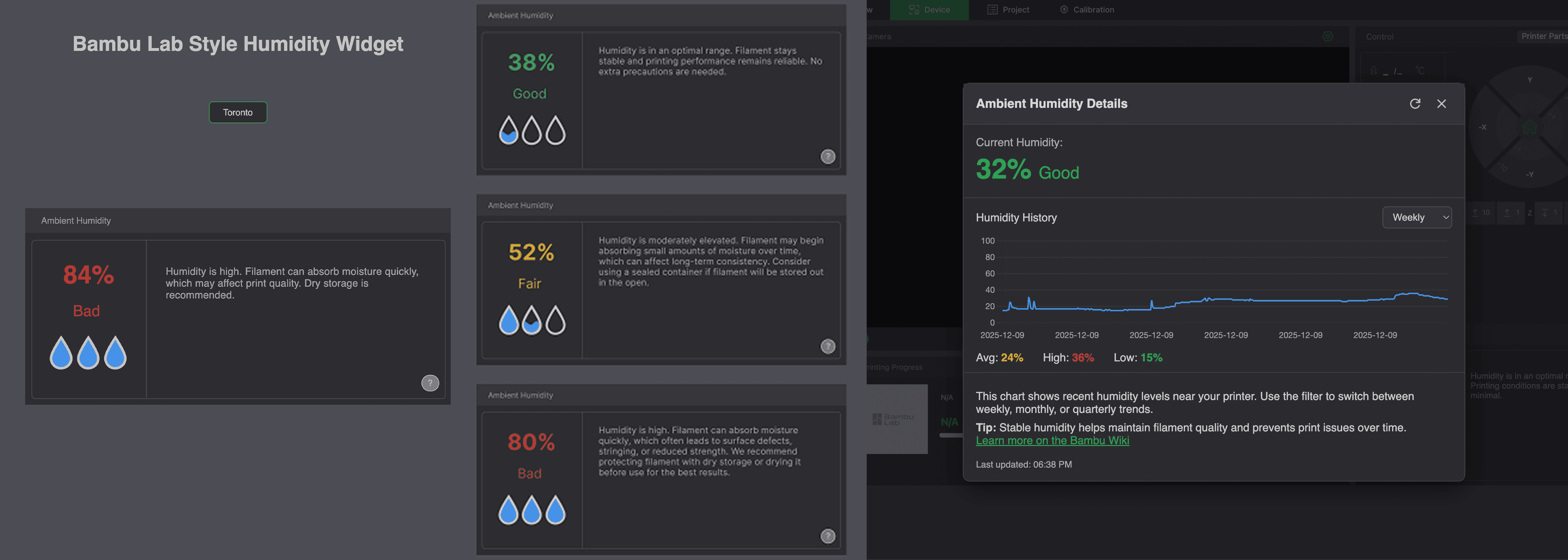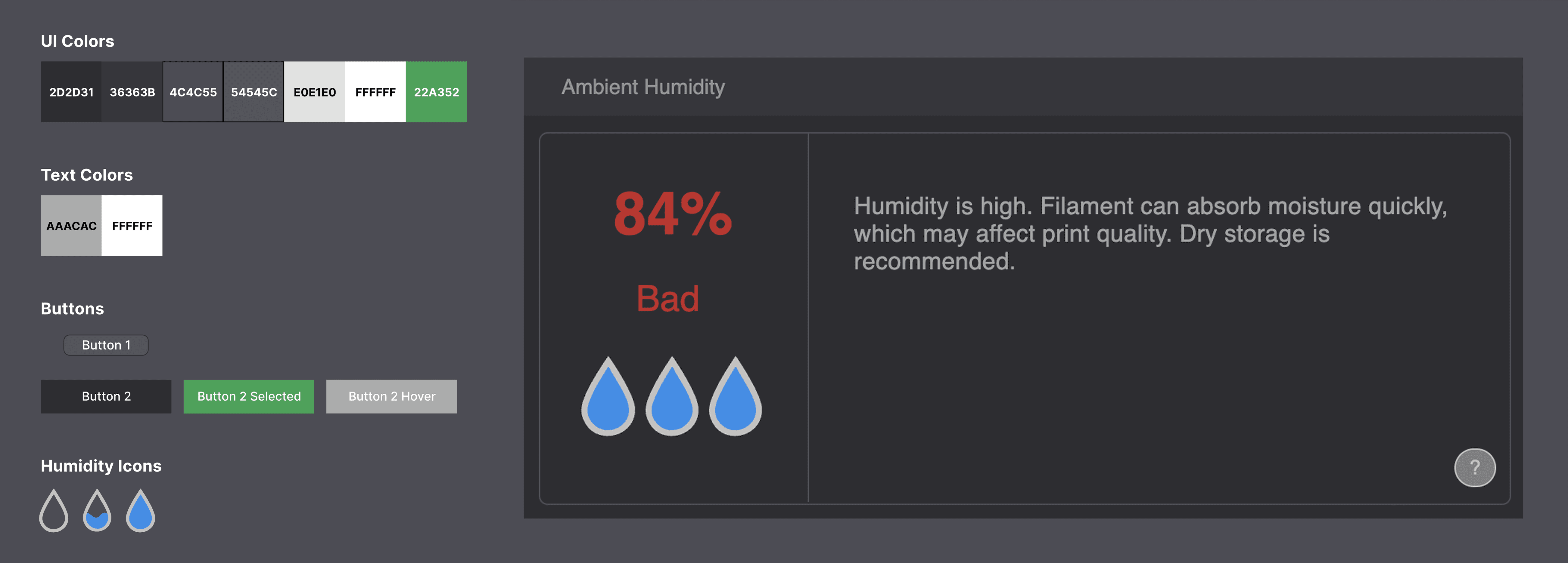 The first iteration focused purely on interface design. I created a Bambu Studio–inspired humidity widget that visually translated percentages into readable states such as Good, Okay, Fair, and Bad. The design emphasized clarity and low cognitive load, pairing a large numeric readout with status labeling and simple water-drop indicators.