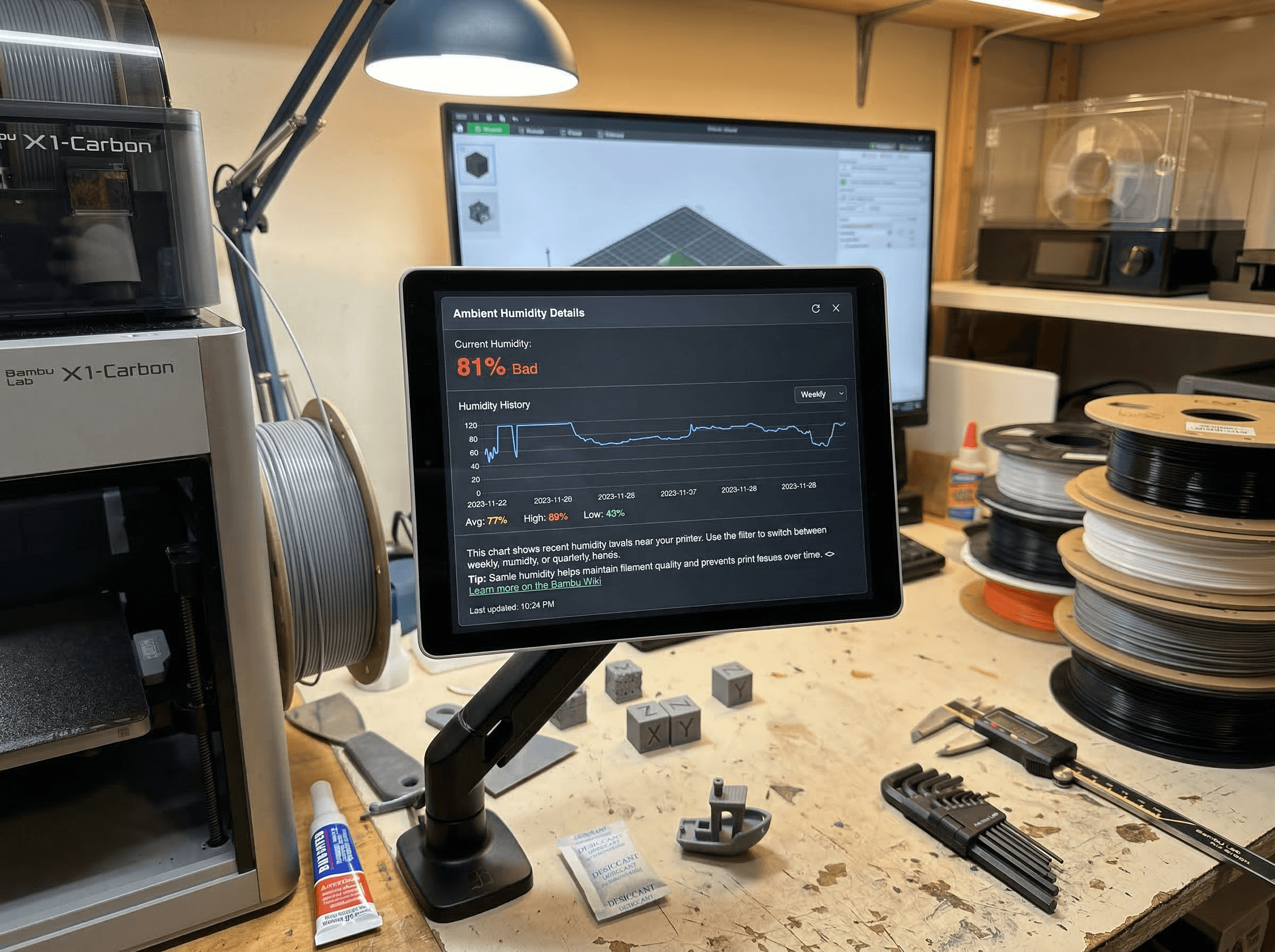 Humidity is one of the most overlooked variables in hobby 3D printing. Filament absorbs moisture gradually, often causing stringing, weak layer adhesion, and failed prints long before the user realizes the environment is the problem. Most hobbyists rely on one-off weather checks or rough assumptions rather than consistent monitoring.